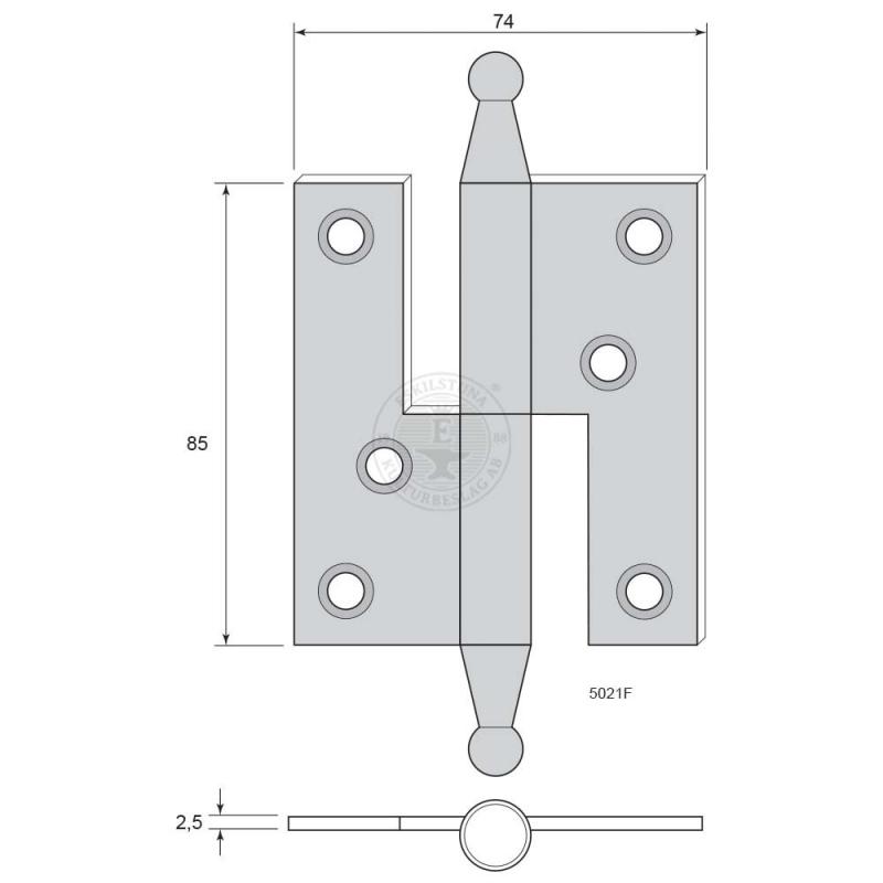 Höjd 85 mm x bredd 74 mm.  Svensktillverkade gångjärn av kallvalsat stål. Efter förebild   Jernbolaget N:o 02a-3½".