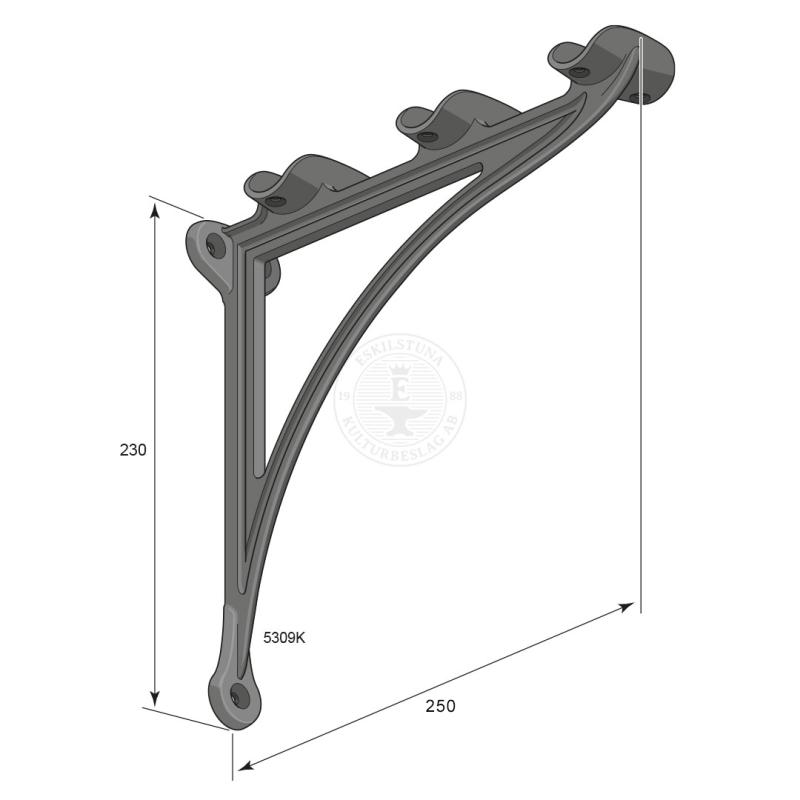 Svensk tillverkning. Hatthyllekonsol av gjutjärn tillverkad efter förlaga Eskilstuna Jernmanufaktur N:o 1109. Tidsperiod: 1890- 1950. Svartlackerad.