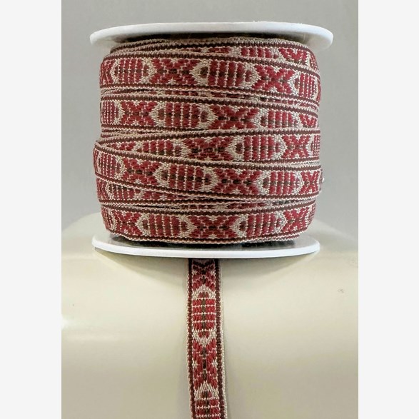 9 mm bredd. Svensk tillverkning. Leksandsband röd/ natur. Säljs per meter.