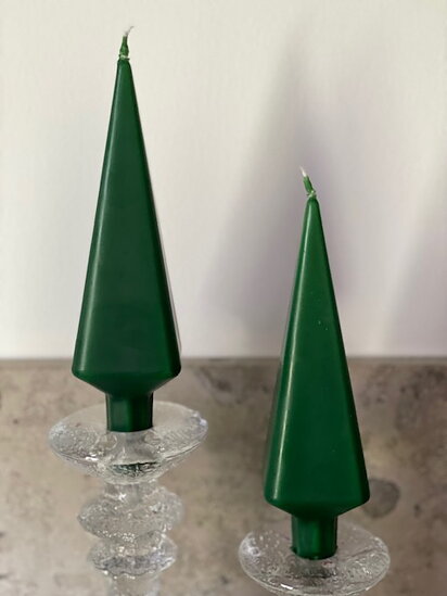 2 stycken. 16 cm höjd. Svensk tillverkning. Granljus av 100% stearin med konad fot för att passa ljusstake.